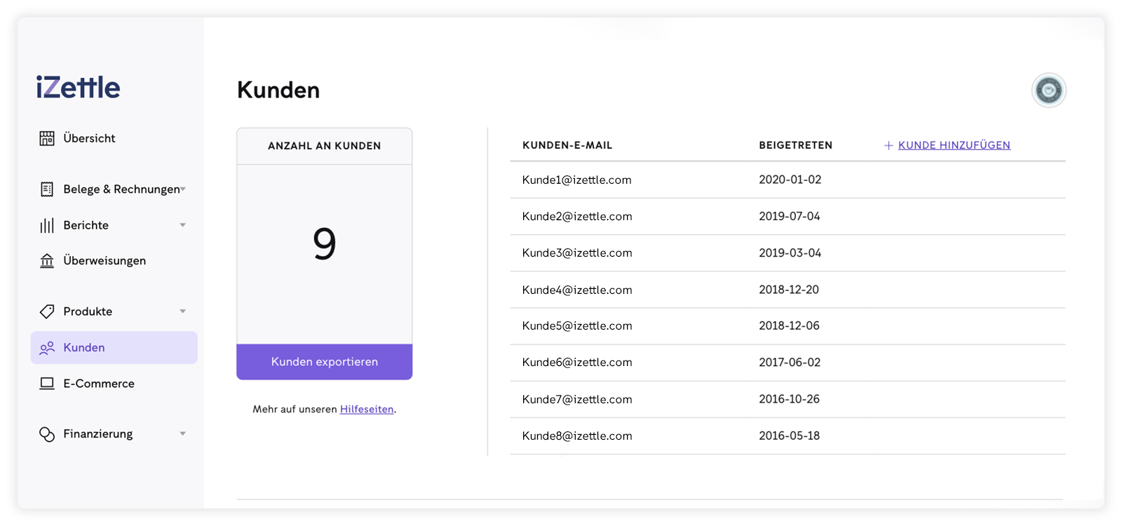 Der Aufbau von Kundenbeziehungen ist einer der besten Wege, Ihr Geschäft auszubauen. iZettle bietet Ihnen eine kostenlose und einfache Möglichkeit, mit Ihren Kunden in Kontakt zu bleiben. Fügen Sie einfach nach einem Verkauf die E-Mail-Adresse des Kunden zu Ihrer Liste hinzu, die Sie anschließend über den Tab „Kunden“ auf my.izettle.com exportieren können. Über einen Dienst für E-Mail-Marketing wie z. B. MailChimp können Sie dann Ihren Kunden Newsletter zusenden oder sie über besondere Angebote informieren.