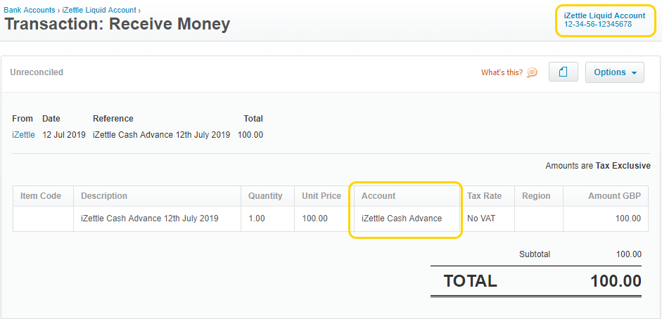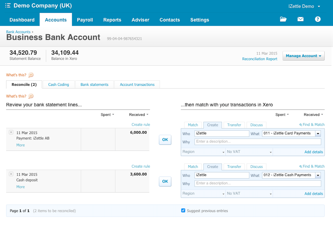 In order for Xero to reconcile your iZettle card and cash payments, we need to do an initial 'Create' for your iZettle deposits. Once a deposit has been made into your bank account, this transaction will show up under your bank reconciliation page in Xero. The first time iZettle makes a deposit to your bank account in Xero, please create a match and select your iZettle Card or Cash Payments account as applicable. The next time you visit your Xero bank reconciliation page, Xero should automatically suggest the receive money transaction – you just need to click "OK".