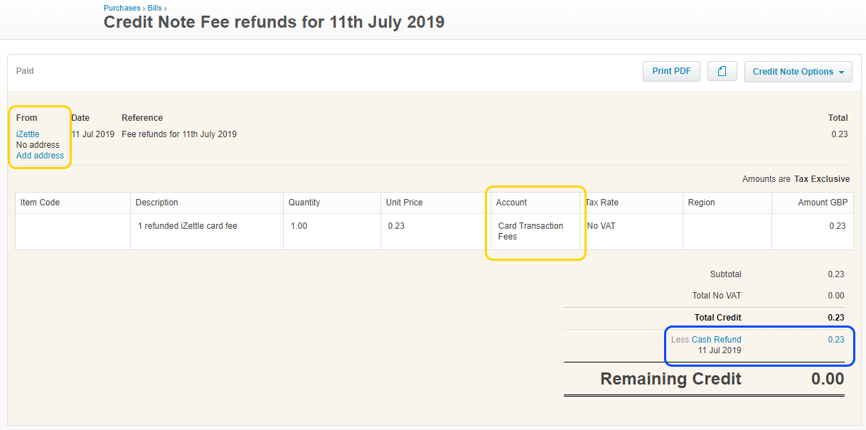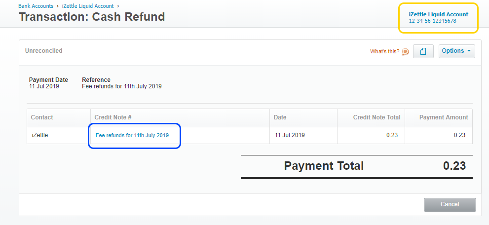 For fee refunds, a single bill credit note is pushed each day representing all fee refunds processed that day. A “cash refund” payment for the whole value of the credit note is simultaneously pushed, so the bill credit note is fully paid (as no further cash is owed by iZettle). This payment is paid into the same account selected to receive iZettle card payments into.