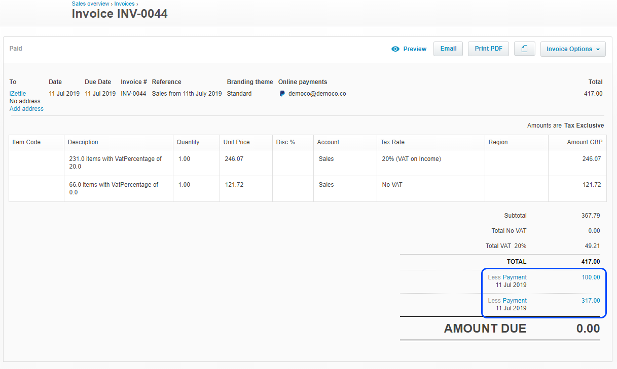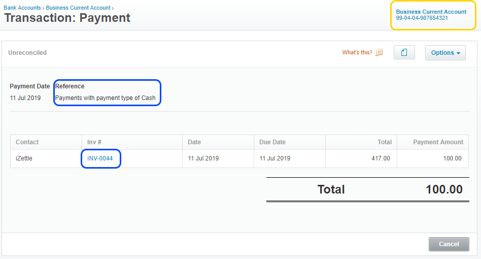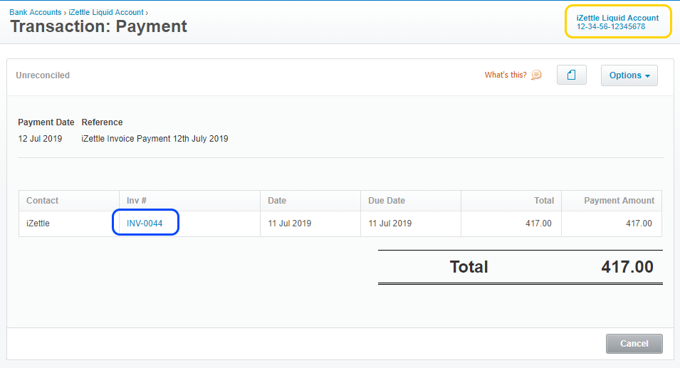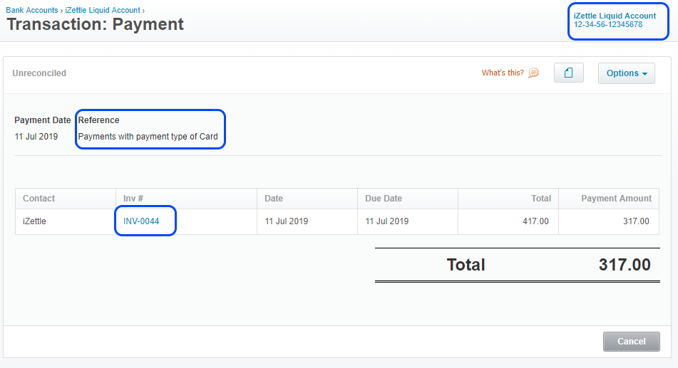 When the customer has made a payment against the invoice, the payment is pushed against the original invoice. This payment is booked against the Invoice payments account, which should match the iZettle liquid account as this is where invoice payments are paid into. If the payment pays the invoice in full, at this point the invoice will be marked as paid in Xero.