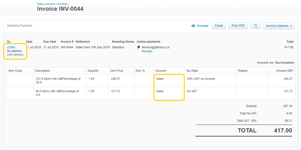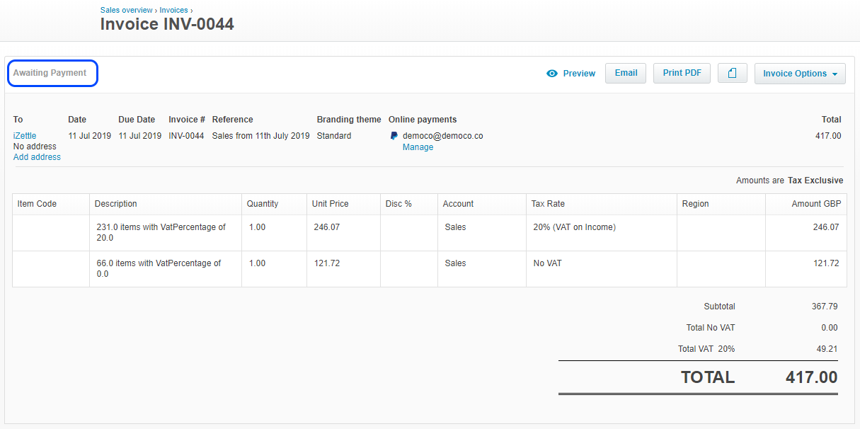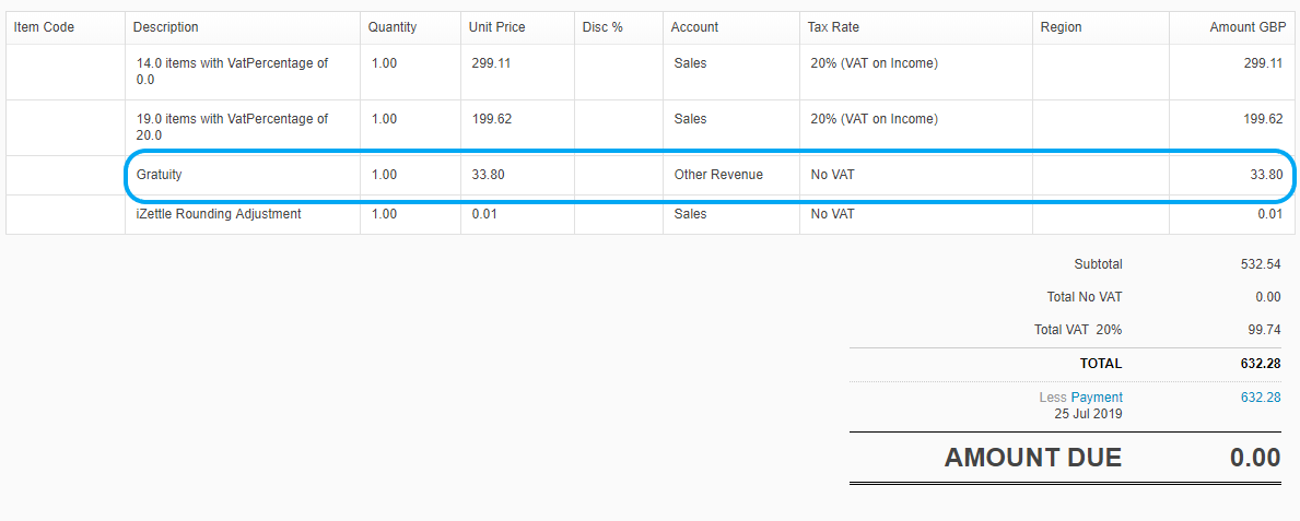 With daily sales recording switched on, iZettle pushes a single sales invoice to Xero each day. This invoice represents all sales made over the course of that day. The invoice will contain one line item for each tax rate, with this line item representing the total of all sales at that tax rate. If no sales have been made for a given tax rate on that day, the corresponding line item will be omitted. The sale will be recorded against the iZettle customer, and the sales account for all line items will be set to the iZettle sales account.