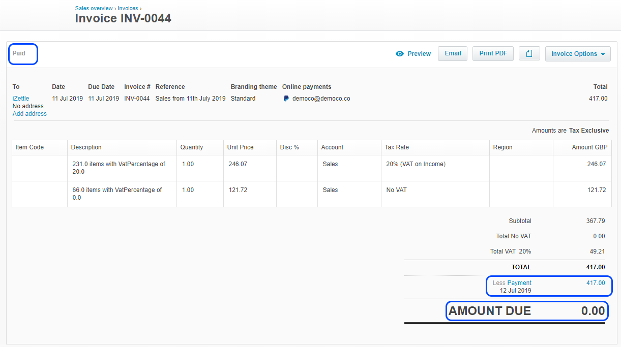 The sales invoice is marked as paid and is balanced by current asset accounts in Xero representing cash payments, card payments and other payment methods, which when settled can be reconciled in the Xero bank feed to reduce their respective balances to zero.