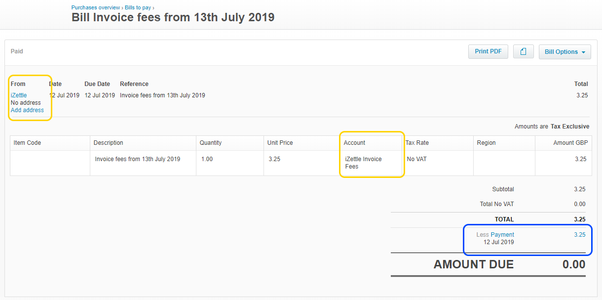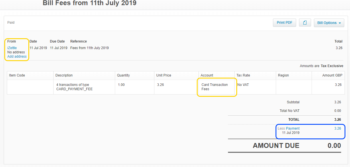 iZettle pushes a single purchase invoice (bill) to Xero each day. This bill represents all fees taken by iZettle over the course of that day. The bill will contain a single line.