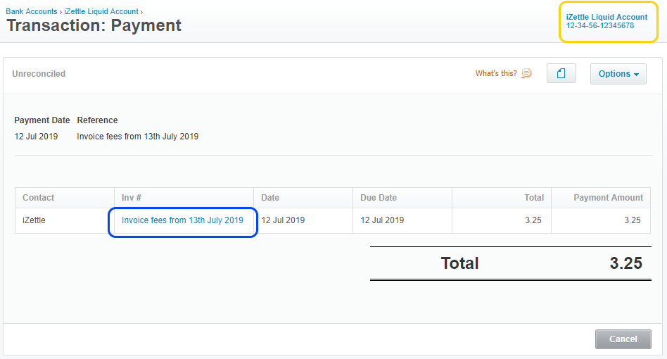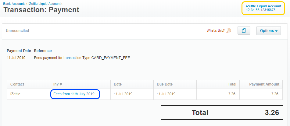 A single payment is pushed for the full payment of the bill, representing the transfer of money out of the liquid account to pay the fees. This payment is taken from the account selected to receive iZettle card payments into.