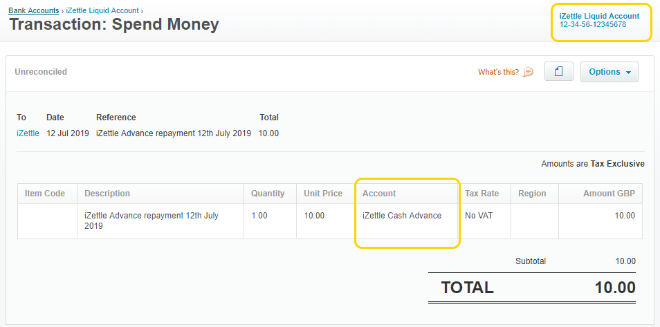 - Cash Advance Fees account – a nominal account of type “Expense”. This account will appear in the Expenses section of a profit and loss report. Transactions pushed to this account represent fees on the advance paid to iZettle.