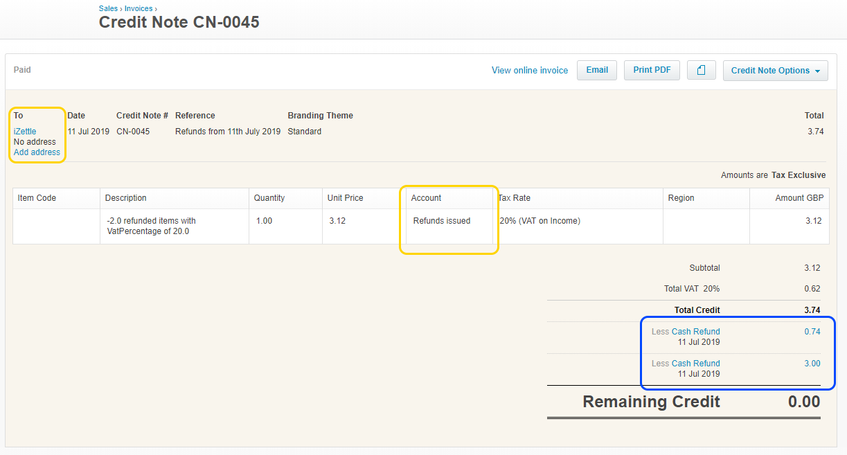 iZettle pushes a single sales credit note to Xero each day. This invoice represents all refunds made over the course of that day. The credit note will contain one line item for each tax rate, with this line item representing the total of all refunds at that tax rate. If no refunds have been made for a given tax rate on that day, the corresponding line item will be omitted. The credit note will be recorded against the iZettle customer (see “Sales” above), and the sales account for all line items will be set to the iZettle refund account.