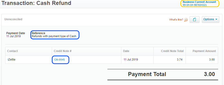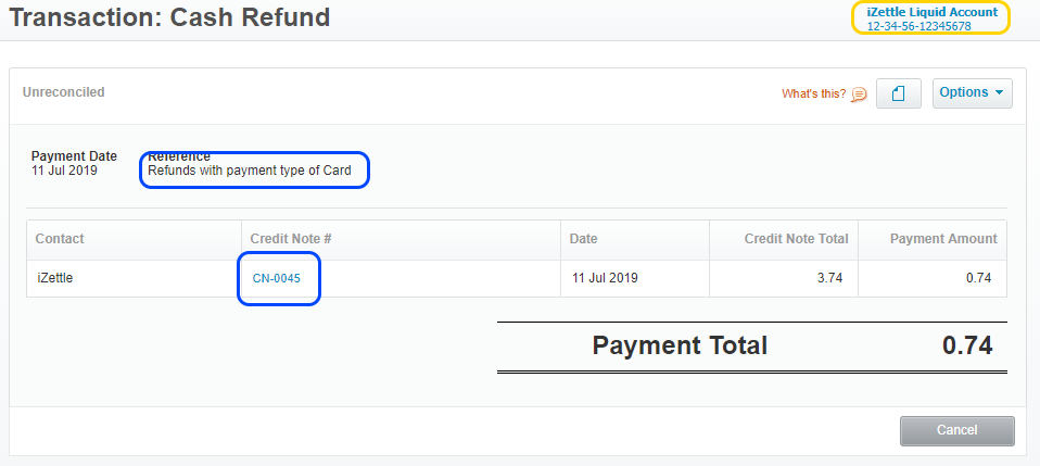 iZettle pushes refund payment data as “cash refunds”. A transaction will be recorded against the credit note for each payment type refunded. This refund will be taken from the selected account to receive payments for each payment type (see payment types below).