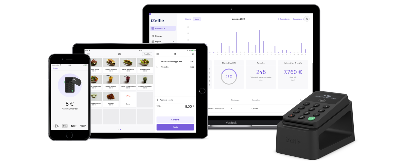 Il lettore di carte di credito iZettle Reader consente a chiunque di accettare pagamenti con carta sempre e dovunque, mentre il nostro intuitivo sistema di gestione delle vendite semplifica l'elaborazione dei pagamenti, il tracciamento delle vendite e la gestione dei prodotti.