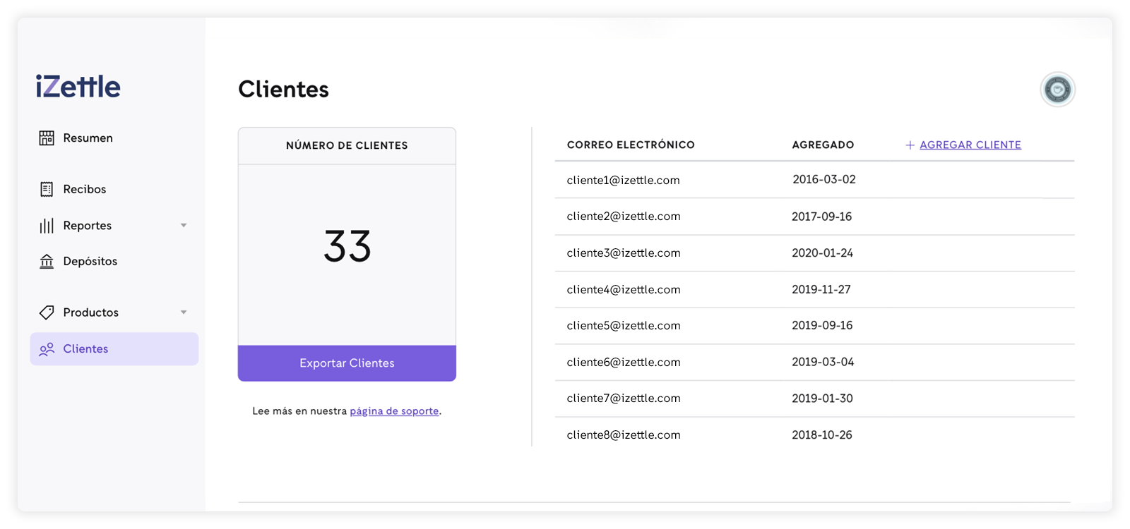 Para activar la opción Clientes, debes tener una cuenta de empresa en iZettle. Si has agregado cuentas de colaboradores para tu equipo, ellos también podrán registrar clientes, pero no pueden activar la opción Clientes.