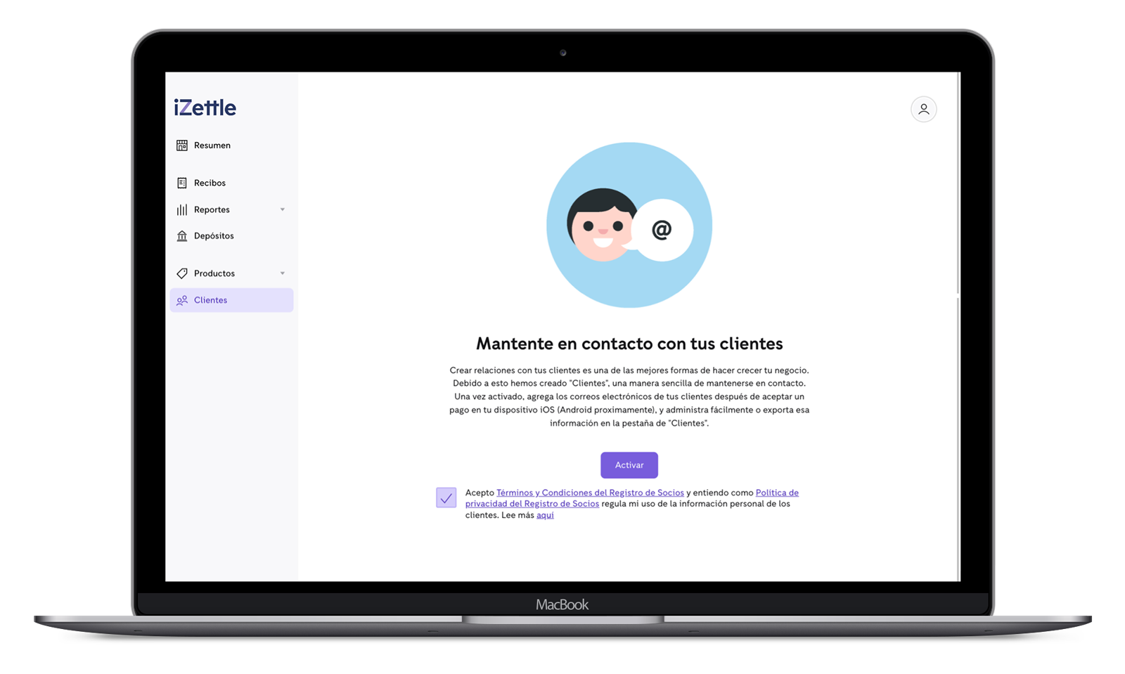 Fomentar relaciones con tus clientes es una de las mejores maneras de hacer crecer tu negocio. Clientes es un método gratuito y sencillo para mantenerte en contacto. Sólo registra las direcciones de correo electrónico cada vez que realices una venta y exporta fácilmente tu lista en la pestaña Clientes de my.izettle.com. Luego puedes utilizar un servicio de mercadotecnia por correo electrónico para enviar emails a tus Clientes (recomendamos Mailchimp).