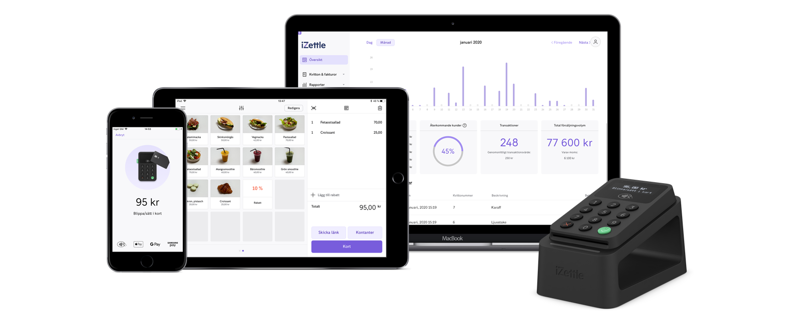 Med iZettle Reader kan vem som helst, när som helst, ta emot kortbetalningar. Med vår intuitiva app iZettle Go är det enkelt att ta betalt, hantera produktbiblioteket och se din försäljningsstatistik. Vi har inga startavgifter, inga månadsavgifter och inga bindningstider. Istället erbjuder vi dig de verktyg du behöver för att fokusera på att starta, driva och utöka din verksamhet.